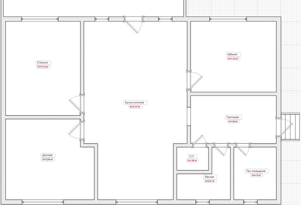 Комнаты такие: кухня-гостинная 32 кв.м, спальня, детская, кабинет по 12-13 м, с/у, тех.помещение для бойлера, отопление электричество+ печка