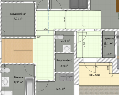 Кстати, можно и через кухонную зону вход в тех.помещение сделать, заодно организовав там кухонную кладовую и переместив спуск в другое место. И гостевой туалет расширить за счёт коридорчика.