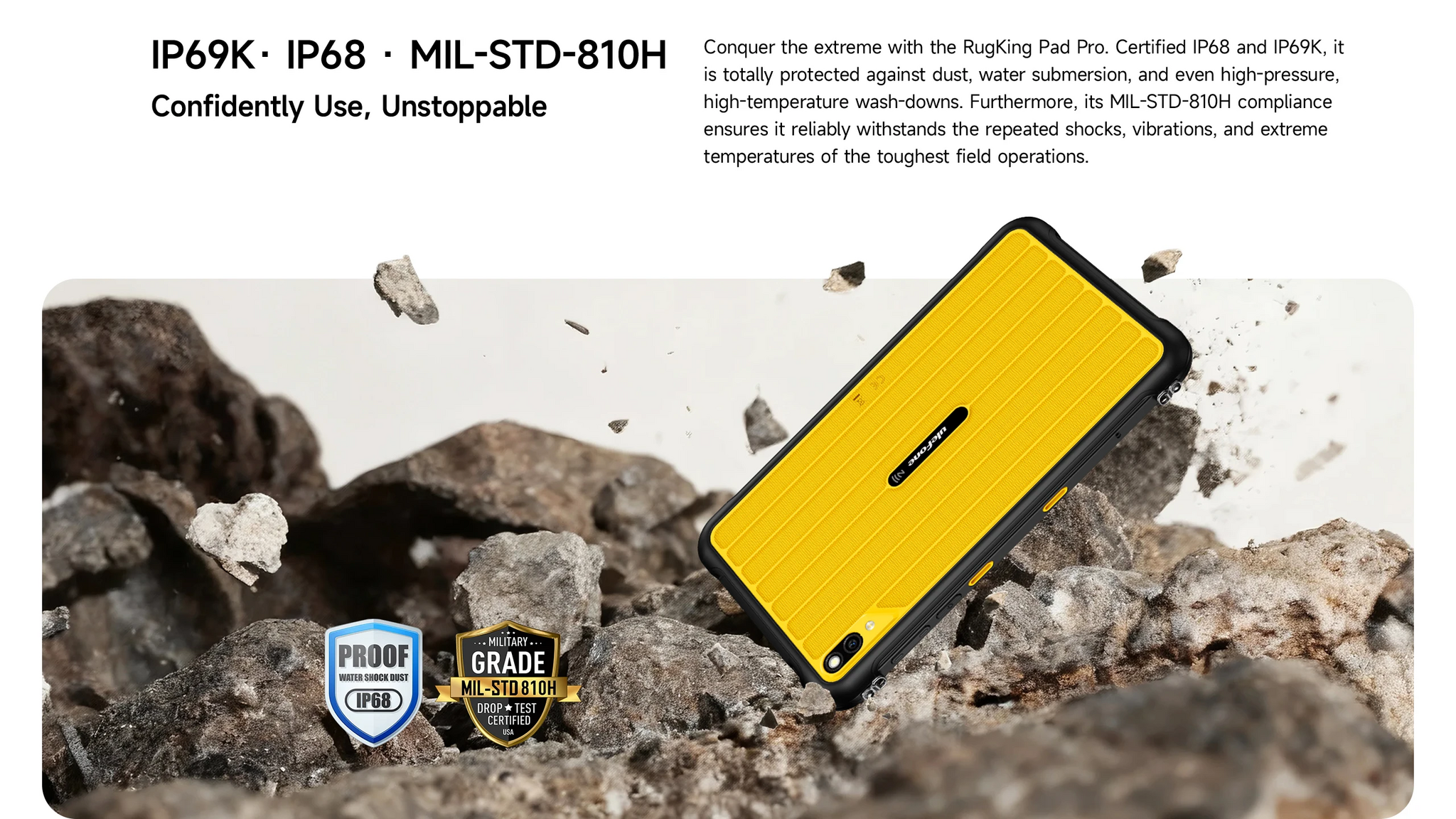 Модель соответствует требованиям стандартов защиты IP68/IP69K/MIL-STD-810H, гарантирующим полную защиту от влаги, пыли и механических воздействий. Дополнительный держатель для руки упрощает эксплуатацию устройства в тяжелых условиях.