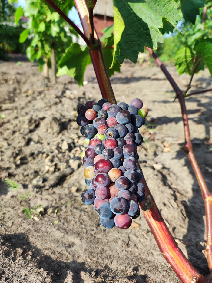 Фото от 13 августа, он даже не начал окрашиваться, а будет синим. Но в итоге даже сахар набрал, хотя выращивать в нашем регионе крымские сорта в открытом грунте - та ещё затея. Оставлю ещё на годик- два, посмотрю, уж больно хотелось иметь сорт, входящий в состав знаменитого вина от Солнечной долины.