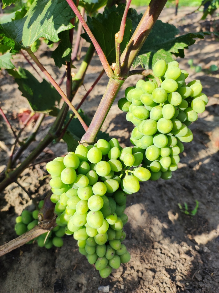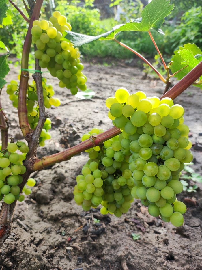 Этому знаменитому неукрывному американцу я выделил аж 3 места, посадив в одно выращенный из черенка, а в 2 следующих - саженцами годовалыми. Заказаны были черенок и саженцы от разных продавцов. И тут меня поджидала еще одна причина выпадения: пересортица. Оба саженца не подтвердили сортность по форме листа и прочим признакам. Было принято волевое решение один из двух самозванцев убрать, а второму дать еще шанс на опознавание. Фронтиньяк из черенка похож на оригинал и по вызреванию был успешно склеван птичками). В виноделии его рекомендуют смешивать с Маркеттом, так как тот некислотный, а этот с кислотой.