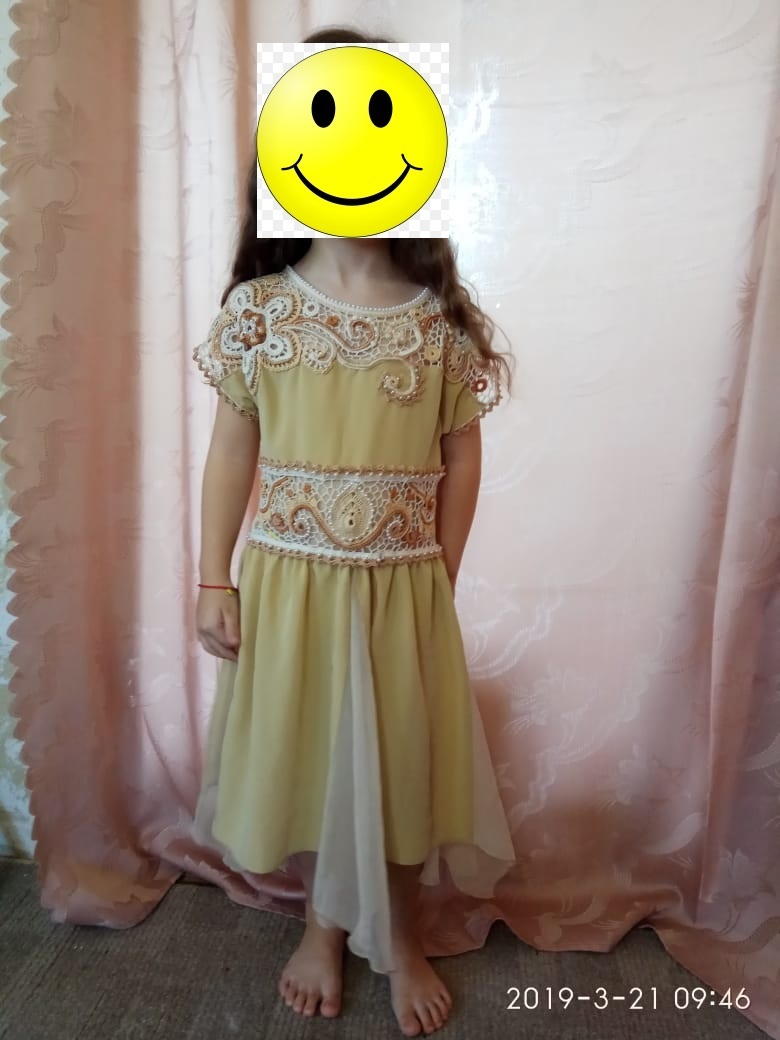 Модель платья я придумала сама. Для начала я сделала выкройку (ее я тоже разрабатывала самостоятельно). Сделала разметки для разграничения кружева и ткани. Пошила не сложную юбку со вставками. У меня нет специальности швеи, может что-то сделано не правильно, но меня все устроило. Далее оставалось навязать мотивы (видео прилагаю), и связать все сеткой. и все! Платье готово
