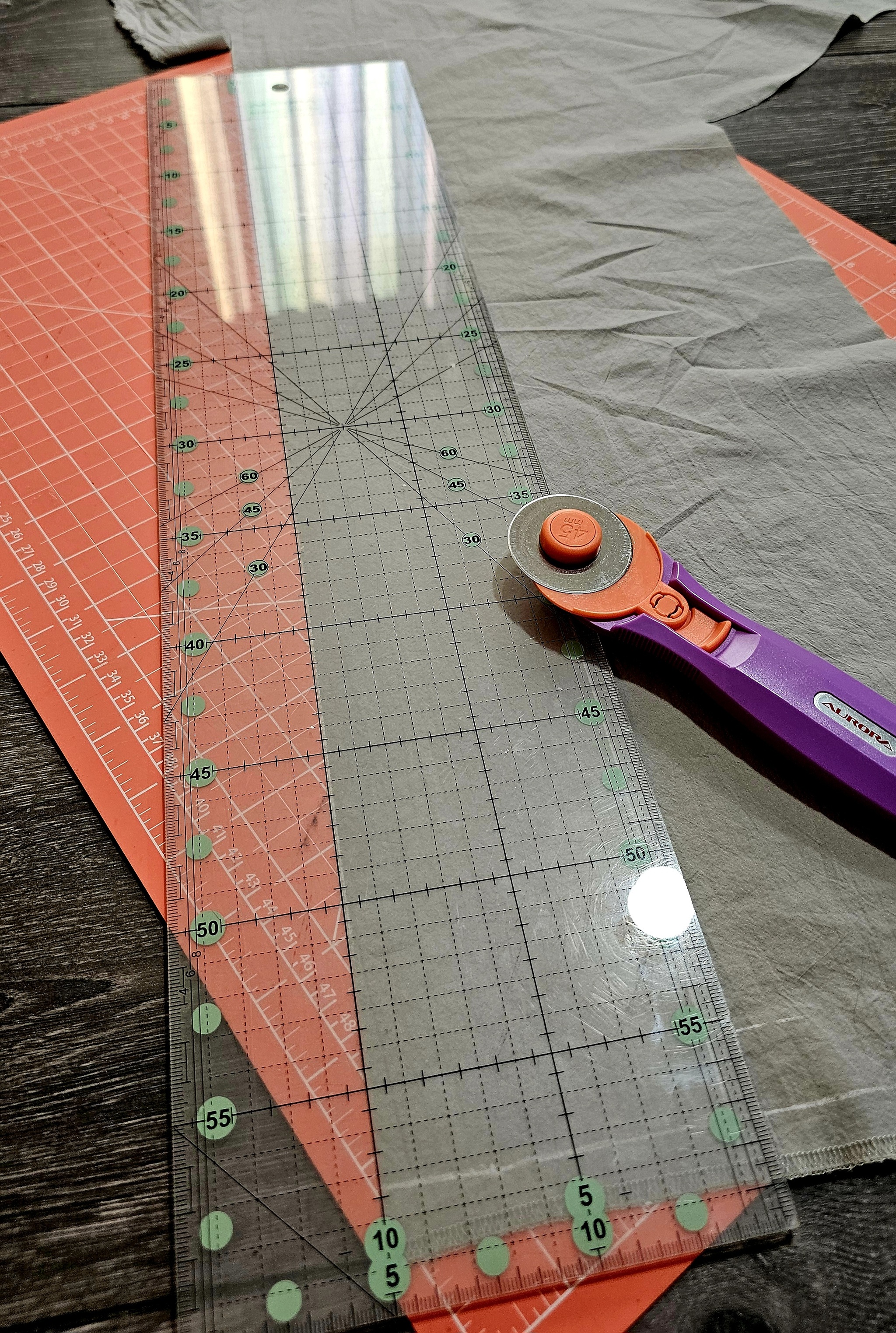Сначала просто выложила все детали выкройки на ткань, чтоб прикинуть, как лучше разместить - за время лежания ткани в шкафу мне её немного попортили - появились пятна, которые не отстирались - пришлось обходить. Детали выкройки не прикалываю к ткани - мне удобнее их прижимать - шайбы из леруа, стаканы, линейка для пэчворка вообще отлично - большая площадь и прямые детали обрисовывать проще.