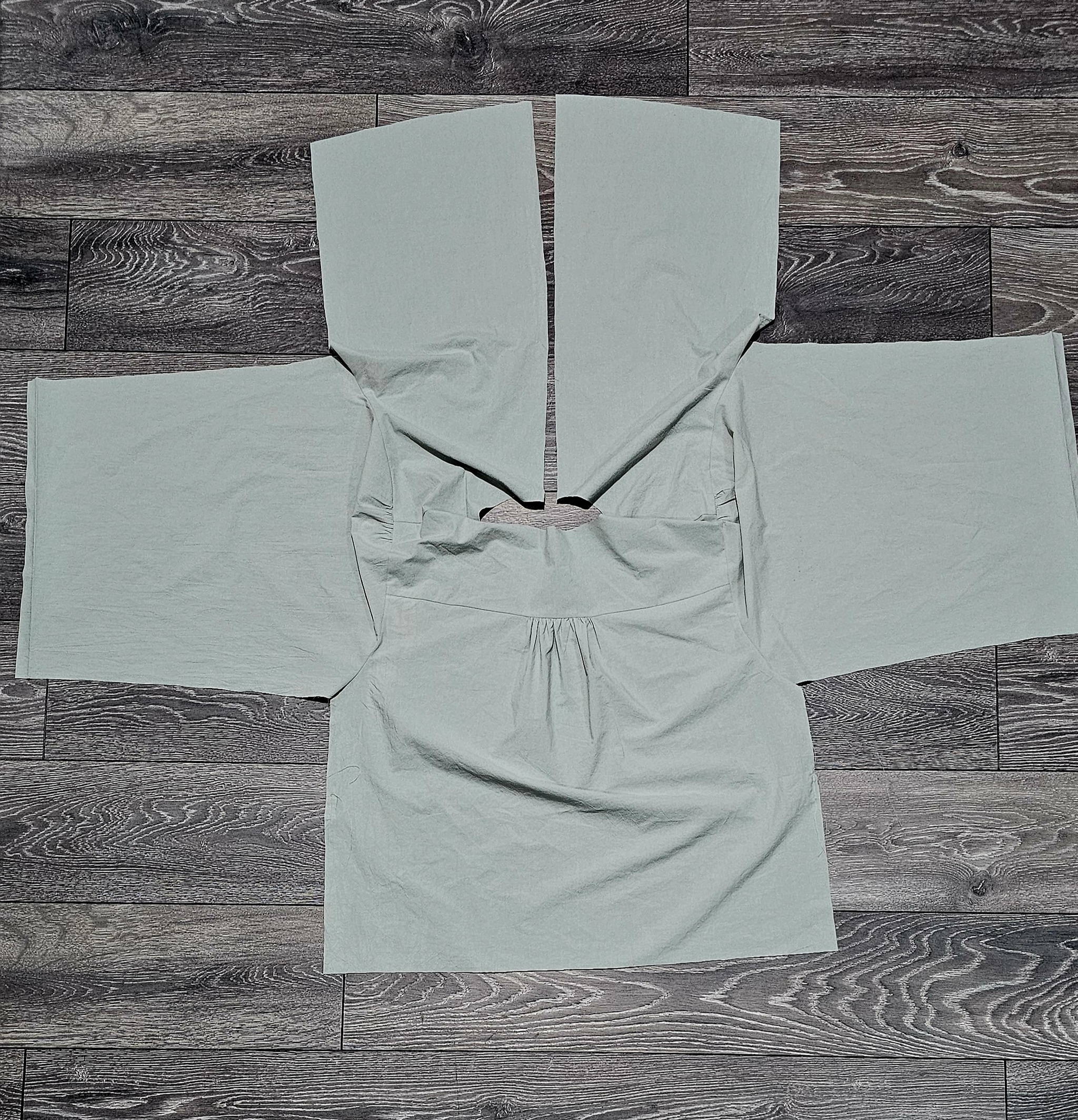 Из изменений - планку сделала до юбки, а не до конца. По двем причинам - пока не очень красиво получается их обрабатывать и цельная юбка мне кажется более гармоничной в данном платье. Больше ничего не меняла, село хорошо, но иначе и быть не могло - фасон очень свободный.