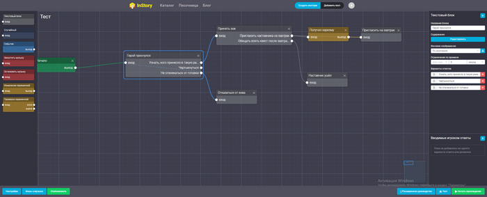 Всё написанное можно тут же протестировать, но запускаться история будет всегда с самого начала, вне зависимости от выбранного блока. Эта особенность вместе с отсутствием сохранений делает InStory плохим выбором для длинных и ветвистых историй.