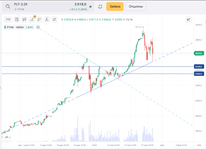 С учетом того, как сильно начали заливать золото, у меня нет уверенности, что платина (фьючерс PLT-3.26) удержится в рамках растущего канала..🤔 Но пока что наклонная канала показывает хорошую реакцию: от 2510 актив выкупили моментально, так что осталась лишь тень.