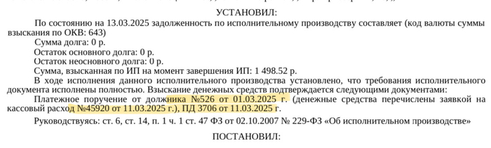 Вот с таким же лицом катаю жалобу, что тут что-то у вас не сходится. Прикладываю чек из этих же госуслуг. На это мне в течение часа (а это уже почти 10 вечера) закрывают исполнительное производство по долгу в 1498 рублей. И вроде бы все хорошо, ну ошиблась эта Бабак Анастасия, с кем не бывает. Но! На следующий день прилетает постановление о взыскании исполнительского сбора в ту самую тысячу рублей на основании того самого отмененного ИП (вот прямо номер указан, дата, все дела). Пишу новую жалобу, все указываю, прикладываю... Вот только в этот раз ничего они не отменяют, а присылают в госуслуги платежку на оплату. Лезу перечитывать отменяющий ИП документ и натыкаюсь на такую строчку