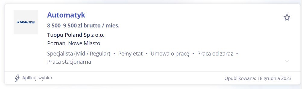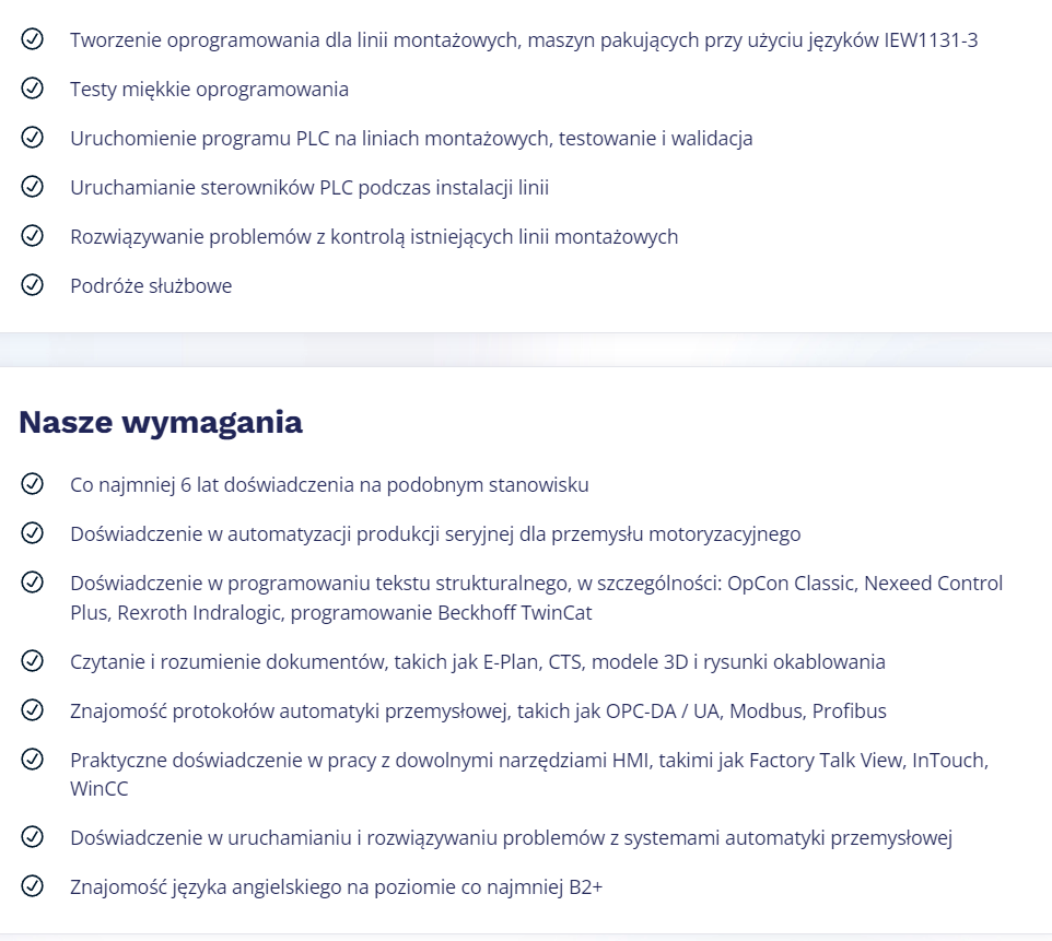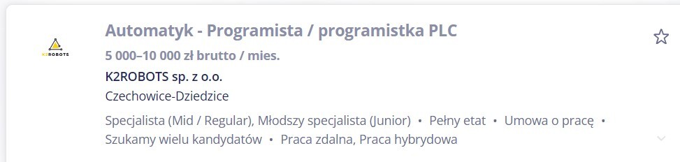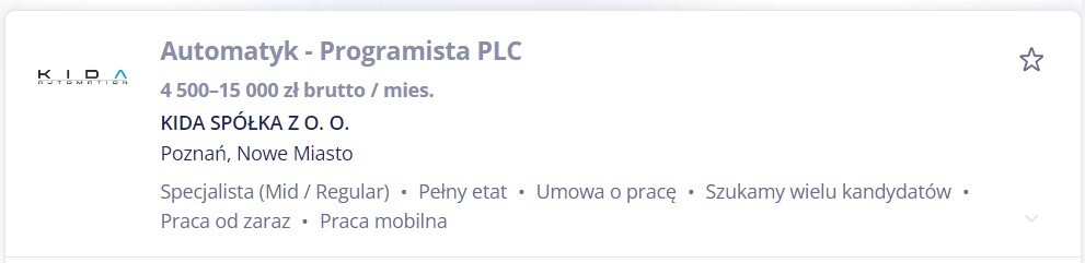 почти 88% работодателей пытается наебать тебя на входе, и этим Польша очень сильно напоминает мне Россию-матушку. Кстати ПЛЦ - это программируемые логические контроллеры, это такие устройства которые управляют промавтоматикой, стандартные языки программирования согласно ИСО 62 че-та там (блять задолбался на собесах эту хрень нести) должны поддержитвать язык лестничных диаграмм и си-подобные языки. В сумме - это настоящий IT.