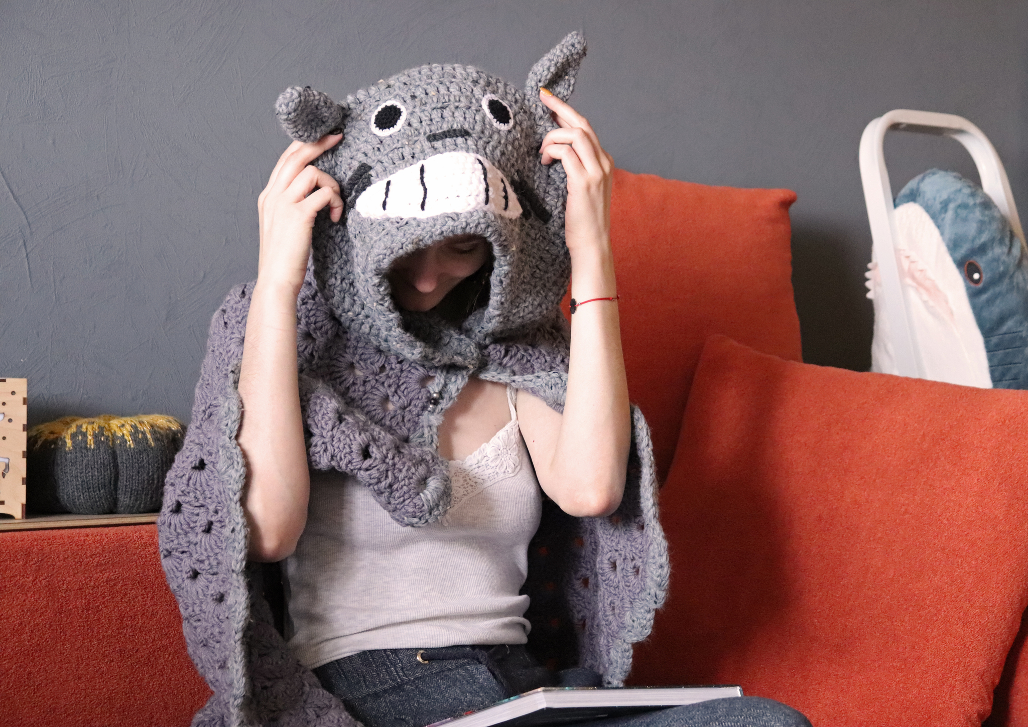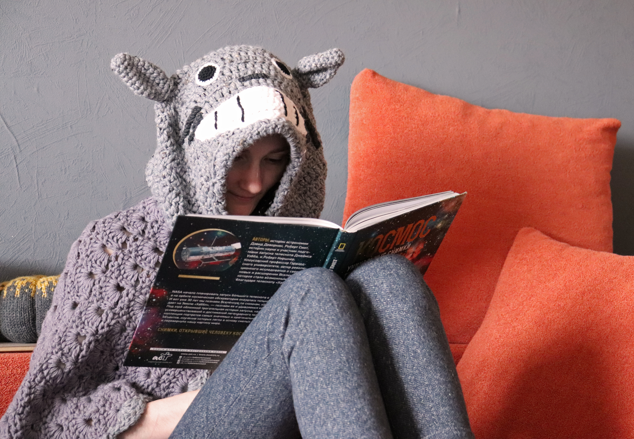 Вообще тут стандартно всё, не то что у нового проекта (но об этом не сегодня). 20 моточков полушерсти: просто серый на основу и меланж на капюшон и обвязку.