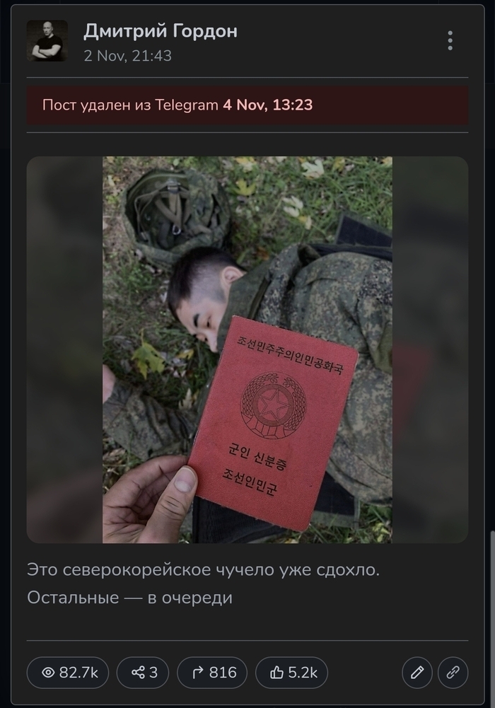 Также администраторы телеграм-канала пообещали скоро опубликовать фото тела пленённого бойца из КНДР. По-видимому, северокорейские военные настолько сильно чудятся ВСУ, что фейки вышли на новый уровень.