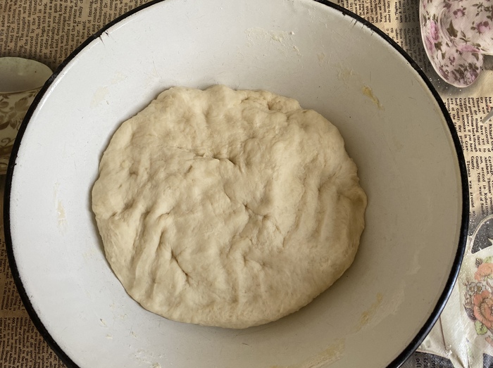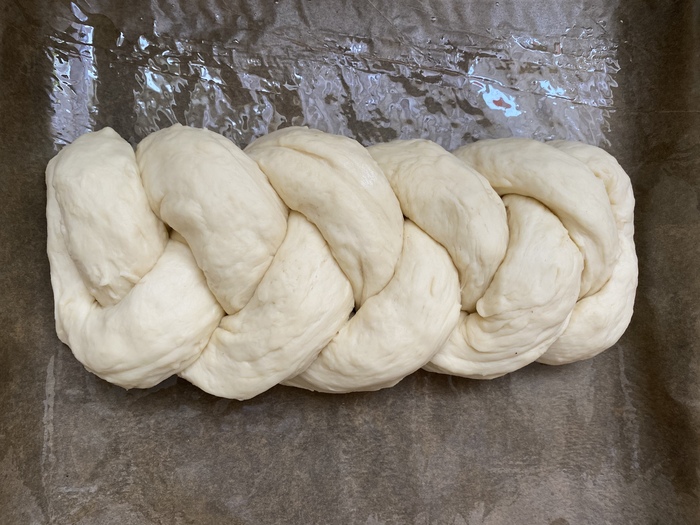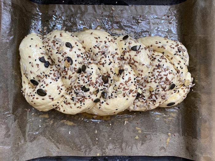 Оставляем тесто всходить в тёплом месте до тех пор, пока его объём не удвоится, затем плетём простейшую косичку, укладываем в противень или форму ( я пекла в противне на бумаге для запекания, смазанной растительным маслом) и оставляем ещё минут на 20.