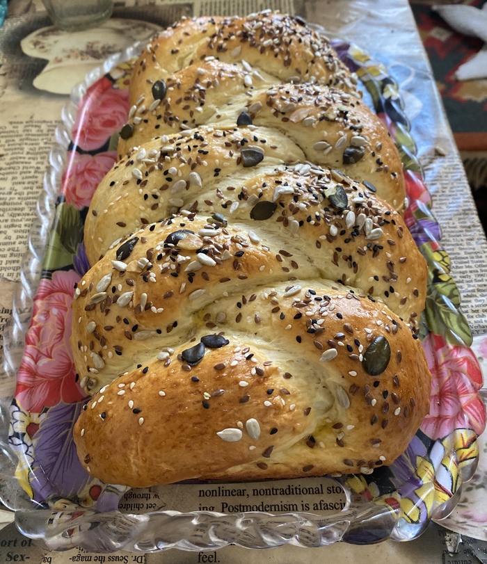 Взбиваем яйцо венчиком или миксером ( у меня нет миксера, так что взбивала вручную) и кисточкой покрываем всю поверхность плетенки, затем посыпаем небольшим количеством мака или кунжута, у меня вообще смесь из четырех семян, так как кунжута и мака на момент похода в магазин в наличии не было.