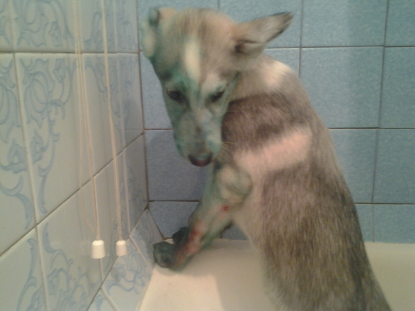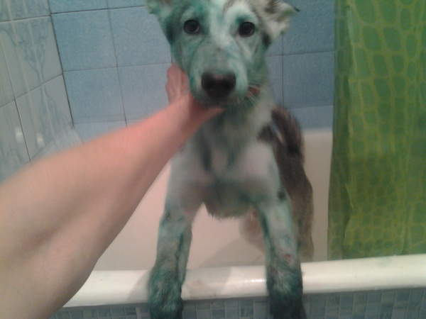 Стянул с тумбочки на балконе коробку моих масляных красок, пока я был на работе. Зеленый, видимо, ему больше всего понравился. Стоит ли говорить про цветные ковры и полы, блевотную радугу на диване и черную жижу непонятного происхождения. С собакой все норм, несколько раз помыл, правда остался зеленый оттенок, почистили желудок ему. Качество фото не очень, но фотосеты устраивать некогда было. Пока что это рекорд :) До этого уничтожил мой паспорт (и свой ветпаспорт) и пару книг.