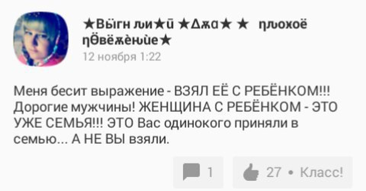 Тезис второй. Настоящий отец и его участие в жизни ребёнка. Тоже очень важно. Если встречаться с девушкой без ребёнка, у которой уже был кто-то, то бывший (бывшие) иногда всплывают в разговоре, но именно иногда и в прошедшем времени. А вот отец ребёнка часто присутствует и в настоящем. Идеально, когда папаша звезданул в неведомые дали или умер. Тогда его просто нет, максимум какие-то воспоминания (позитивные, негативные, не важно) от женщины и/или ребёнка. Но часто он есть сейчас в том или ином виде и это минимум некомфортно.