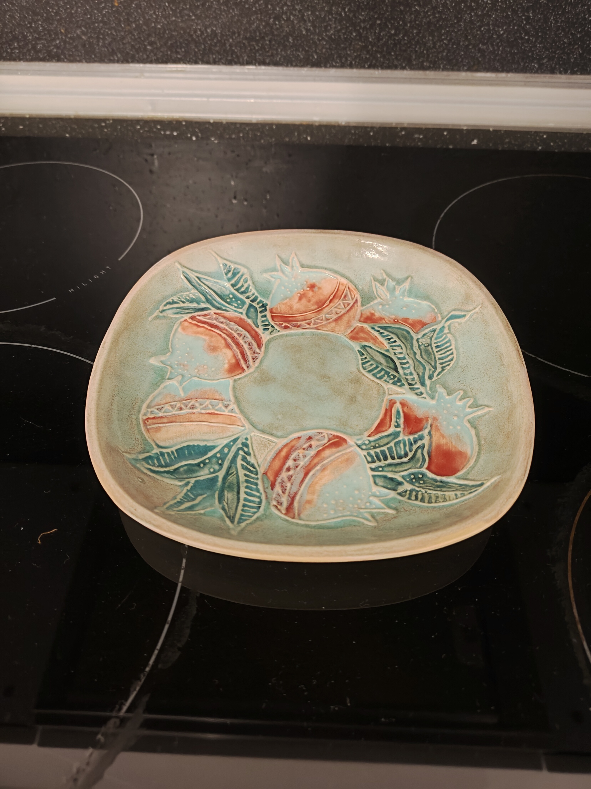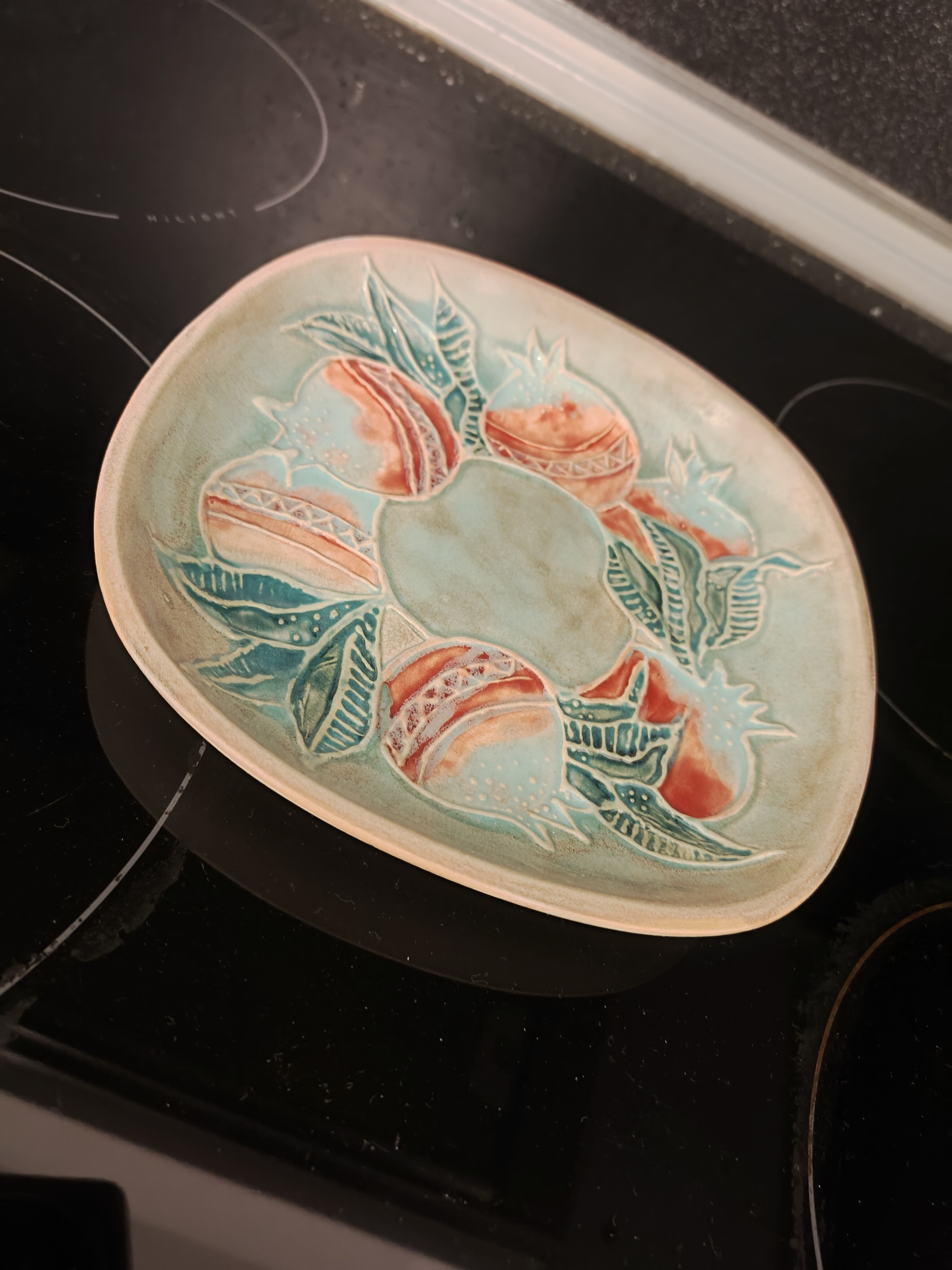 Обычное блюдце, покрытое глазурью. Фигуры гранатов выложены мини колбасками приклеинами на шликер. Микроликбез про шликер можно почитать в этом моём посте с кувшинчиком - Кувшинчик для английского молока. Керамика ручной работы