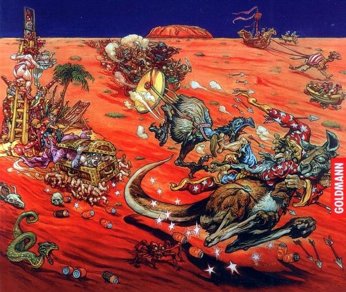 Такие аномалии не могли не сказаться на климате. Большую часть времени на континенте ХХХХ абсолютно сухо: там крутится гигантская облачная спираль антициклона, не дающая воде пролиться на сушу. И хотя в Форэксе много рек, воды там чаще всего нет. Внезапно пошедший дождь для ужастралийцев становится не только благом, но и источником проблем. Приходится отменять регату — если в Занудь-реке полно воды, как верблюды смогут тянуть яхты?