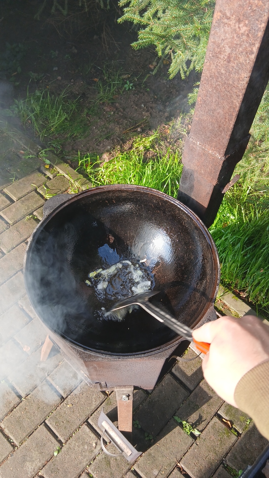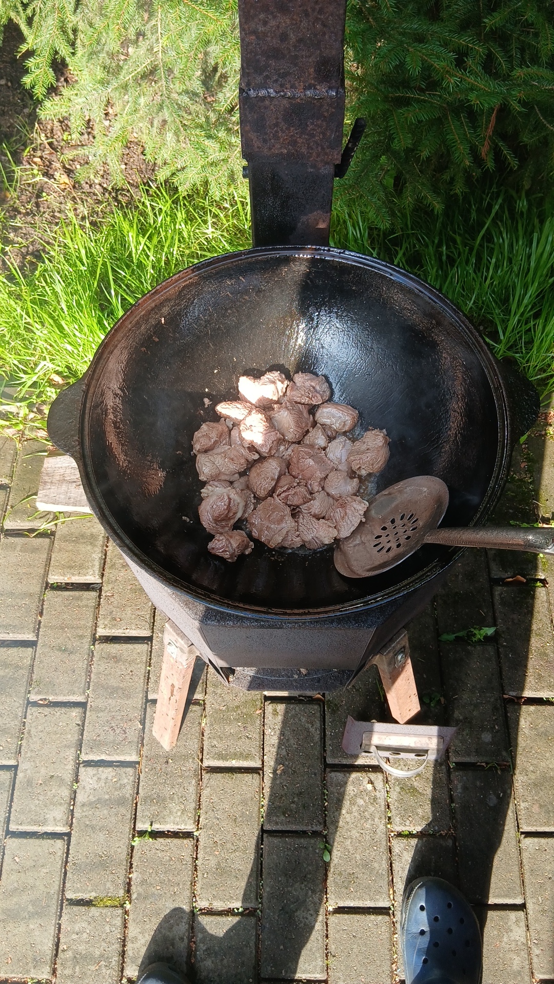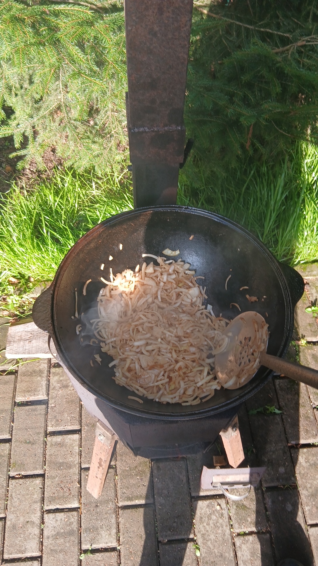 Далее лук. Тут по состоянию смотрю. Когда удовлетворяет, возвращается мясо.