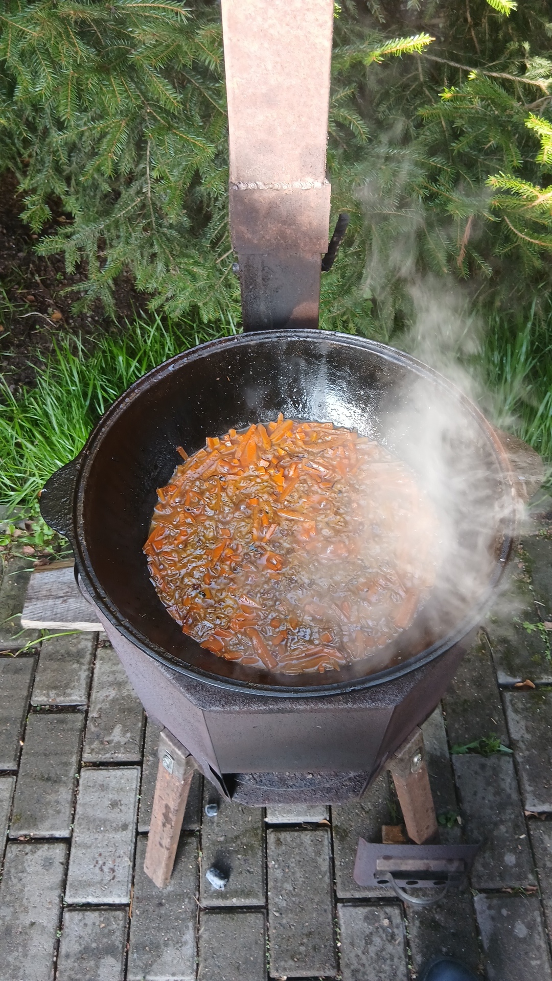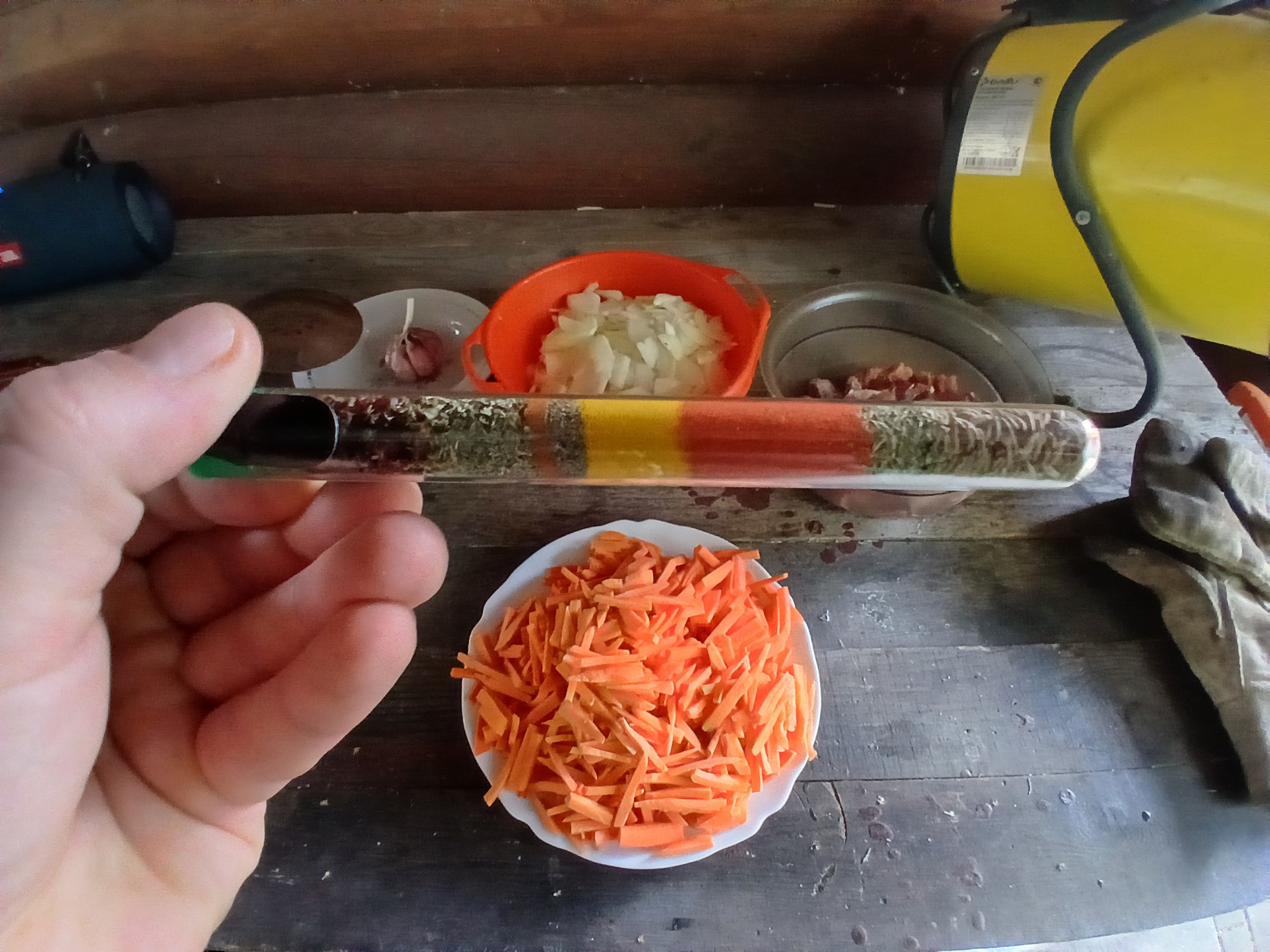 В этот раз морковку и все что ниже заливал говяжим бульоном. Кусок был на кости и решено мясо срезать, кость выварить. Бульон пошёл как основа зирвака.