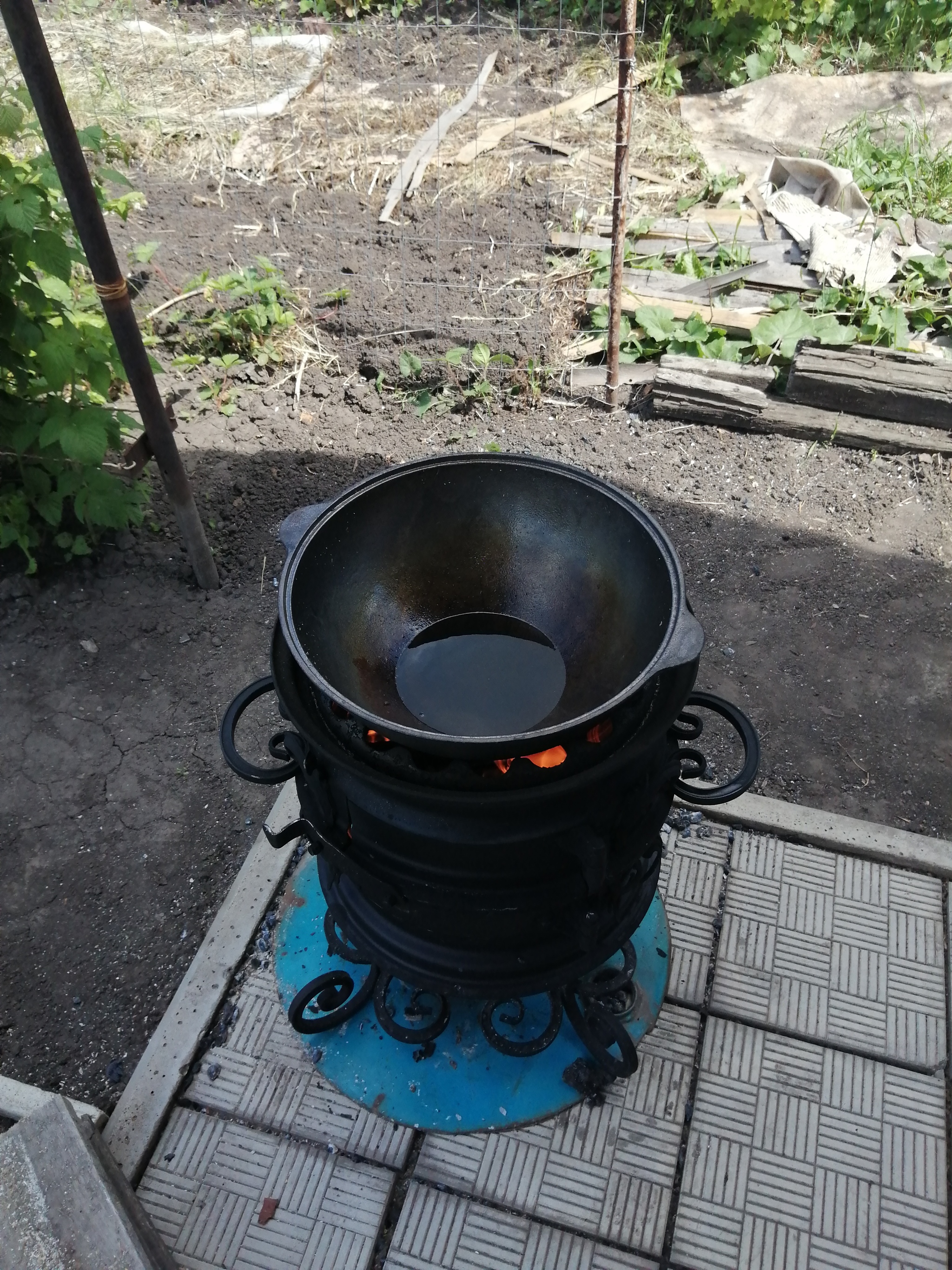 Ставим казан на печку, даем ему набраться тепла. После наливаем масло по стенкам казана. Льем много, не жалеем. Примерно 250 грамм, но обычно делаю "на глазок".