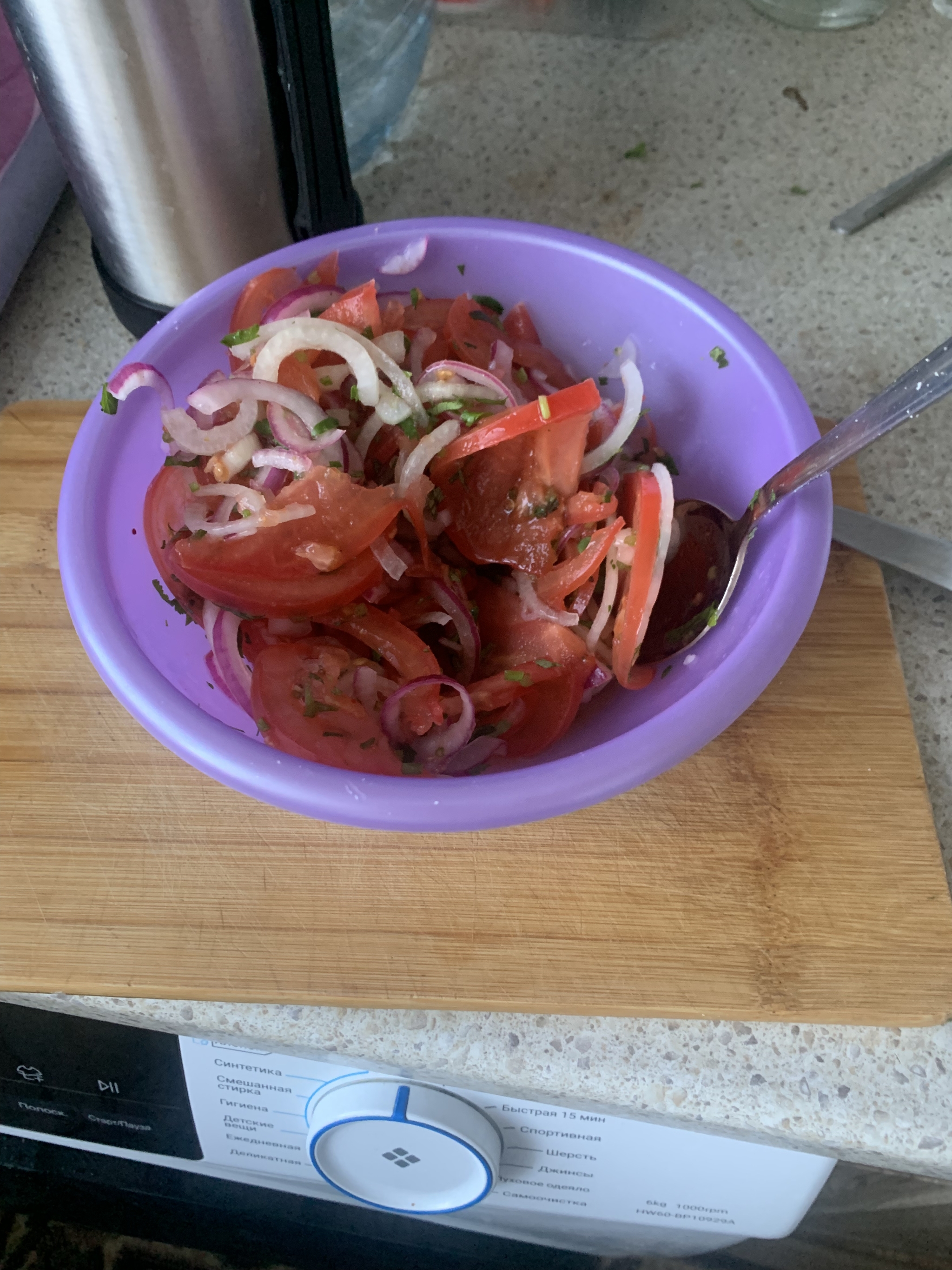 Ну и салатик, там лук и помидор с кинзой да чёрным перчиком