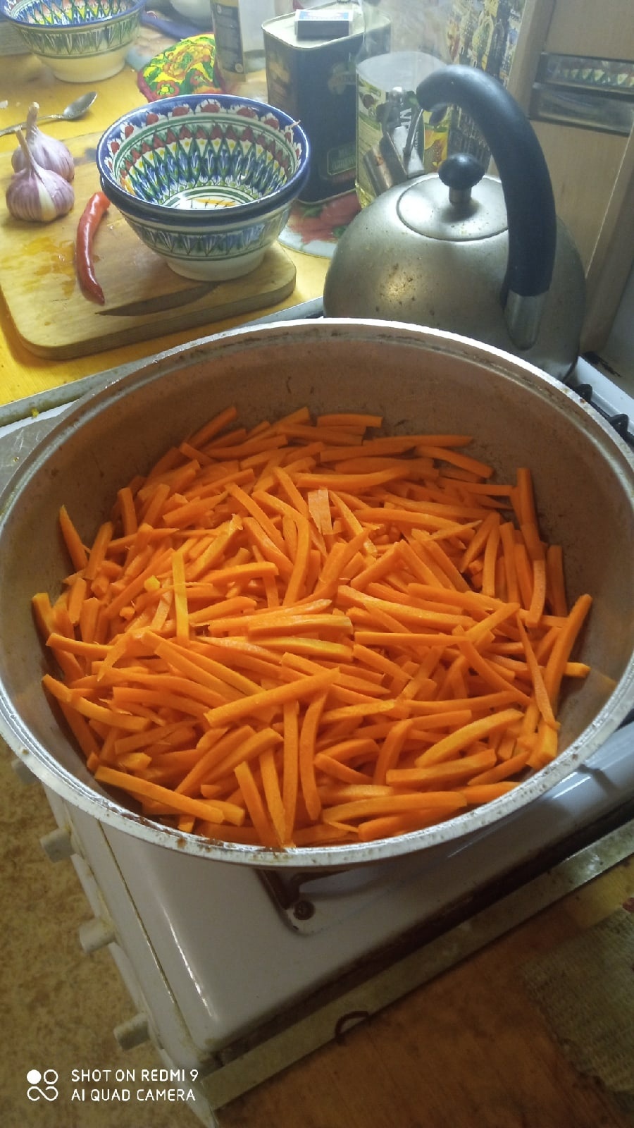 Заливаем кипятком, кладем головки чеснока и перчик. Кипятка ровно столько, чтоб покрыть моркву.