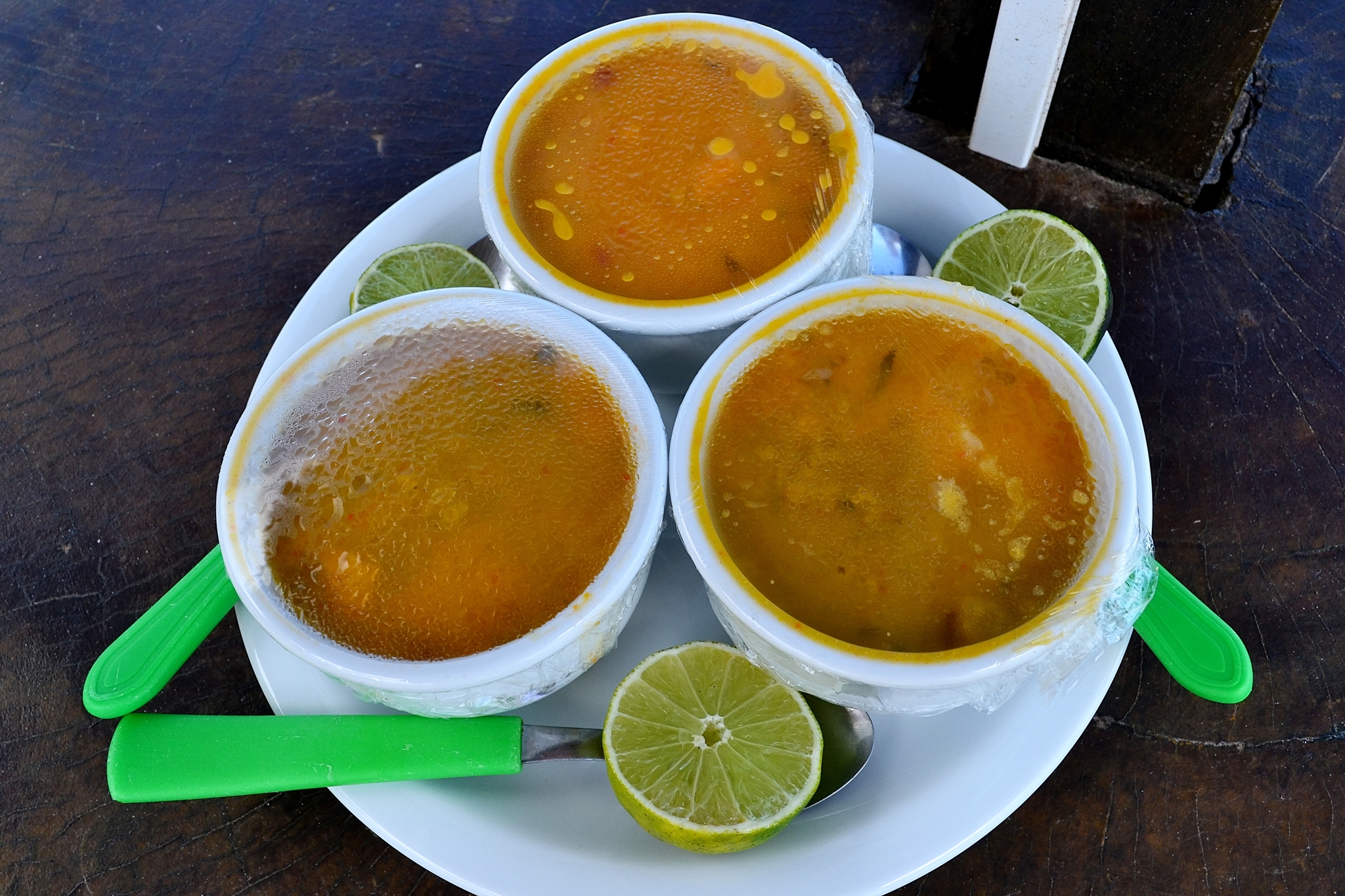 К супу принесли также по половинке лайма. Это традиция поедания супов в Бразилии: ложкой надо зачерпнуть суп и именно В ЛОЖКУ выдавить немного сока лайма - вкус потрясающий, все свежеприготовленное, в жару самое то - и сытно, и не тяжело! Иногда в ложку с супом бразильцы наливают кетчуп или другой соус, но до такого мы на тот период еще "не дозрели":)))