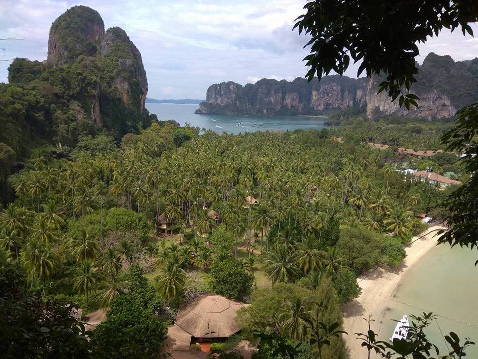 Сверху можно увидеть весь полуостров Рейли и одновременно два пляжа, Западный и Восточный. Дальше наверху тропинка продолжается, по ней можно попасть к лагуне. Но путь к ней еще заковыристее, там есть чуть ли не вертикальные участки (я еле отговорила парней не спускаться к озеру).