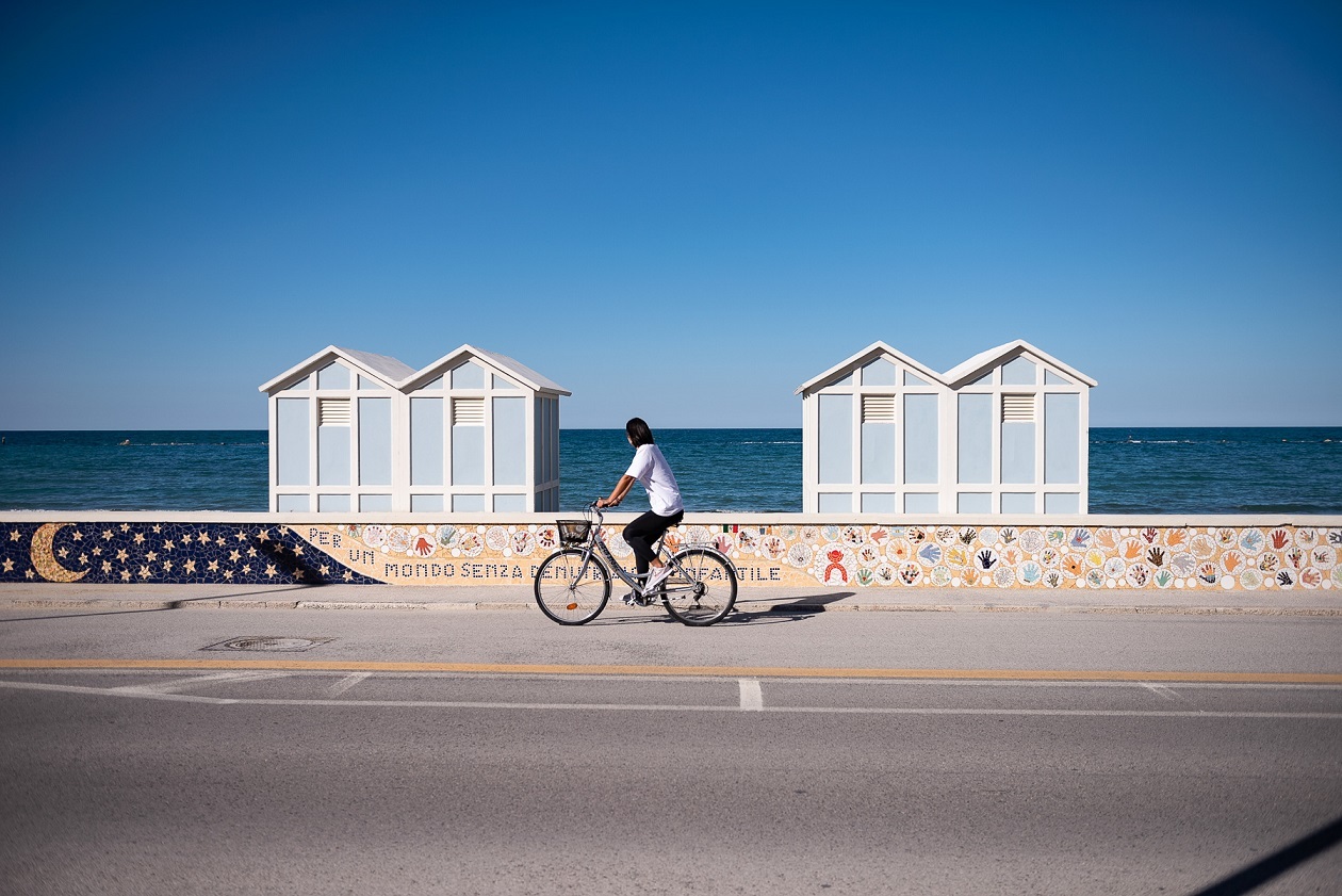 Путешествуем с Хисако на великах вдоль пляжной мозаики итальянского хутора Маротта, коммун Мондольфо и Сан-Костанцо , в провинции Пезаро и Урбино , Марке.