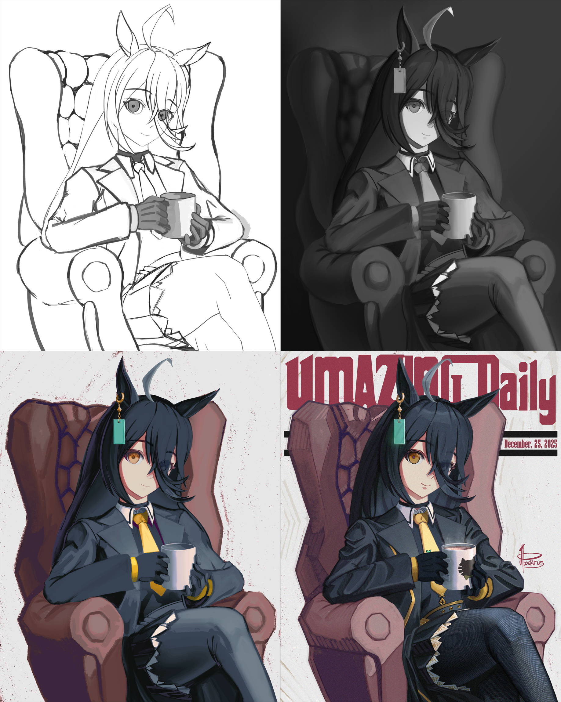 На впечатлениях от дважды просмотренного полного метра по коняшкам-айдолам в декабре потянуло мазать на планшете самого близкого мне персонажа оттуда (по характеру, некоторым чертам внешности, неравнодушию к кофе). Хотелось опять совместить приятное с полезным, а именно не просто сделать очередную попытку в анимешный стиль, но и "украсть" что-то у одного из любимых мной художников.