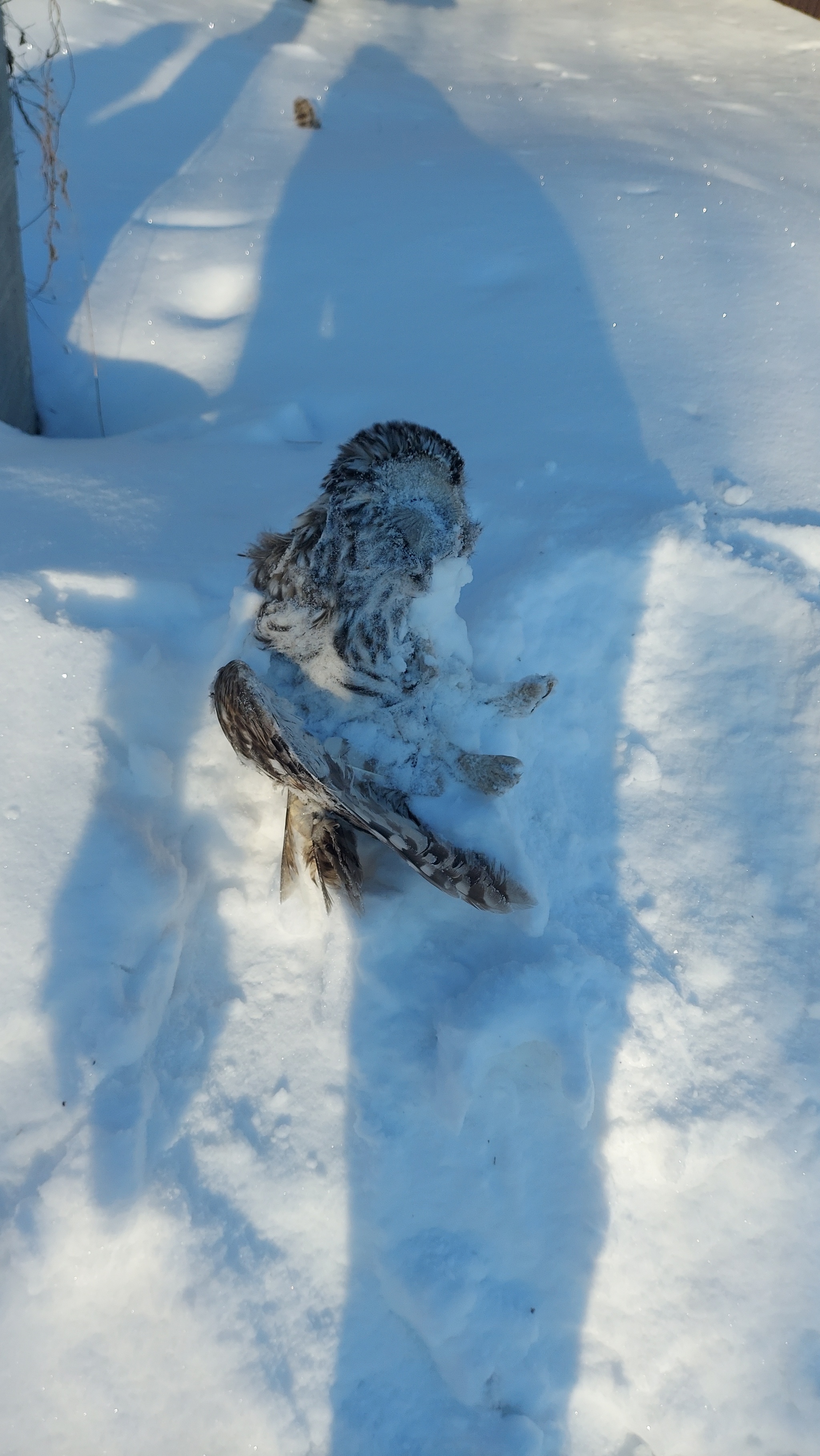 Птичку жалко. Вроде бы серая неясыть, но это не точно.