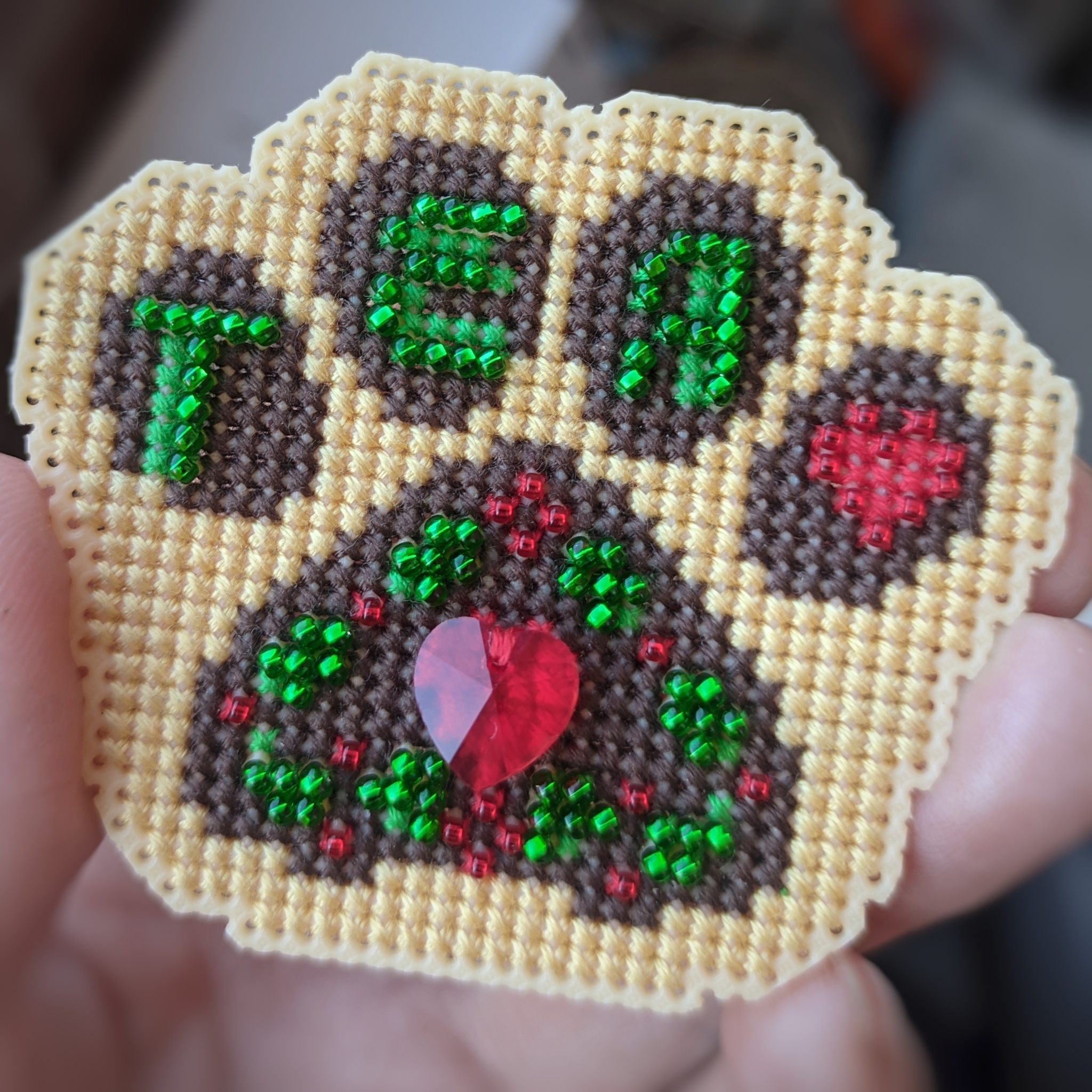 Когда я впервые увидела этот дизайн от Mill Hill, то сразу подумала о лапке своей собаки и решила, что мне такое надо! Конечно же, внесла свои изменения в надпись: в оригинале - joy, а у меня - кличка моей любимицы. Нитки по ключу, бисер подобрала из запасов. Позже сделаю подвес, и будет ёлочная игрушка.