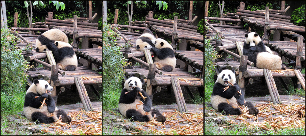 Панды тусят в больших вольерах, на людей ноль внимания. Тусят неспешно так. Если ждать, пока панда сдвинется с места, можно и не дождаться.