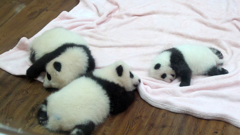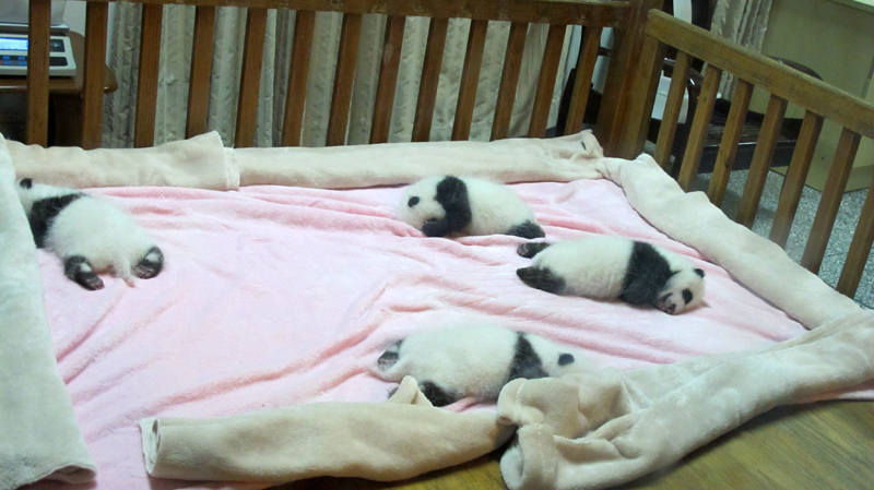 Там же можно увидеть крошечных пандят на одеяле. Лежат, спят, дёргают хвостиками. Конечно, всё это за стеклом, к кроватке посетителей не пускают.