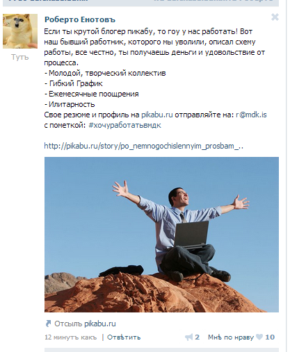 Казалось бы хорошая работа, самому на одно мгновение захотелось побежать стучать в личку админам и устраиваться. Но подумав, я решил отказаться от этой затеи. Даже если бы была возможность, а её нет, т.к желающих набежало много, думаю, из-за поста, я бы все равно не пошел. С виду - работа мечты, а если вглядеться, то так ли она хороша? Если вы уже конченные человек и эти 6 часов тратите на игры и развлечение, то может для вас это и неплохо. Однако, касательно остальных, действительно ли вы готовы 6 часов подбирать, делать самому контент подобного рода, "крутиться" в этом? Многие скажут, что это на них совсем не повлияет, особенно если абстрагироваться от всего этого. Однако это отнюдь не так, даже если по-немногу каждый день засорять себе таким голову, но деградация будет налицо и постепенно вы сами уподобитесь типичным подписчикам сего паблика, а кроме того, подобного рода работа не дает разиваться и не научит ничему полезному. Если каждый день эти 6 часов тратить на обучение чему-либо практически полезному, то вы добьетесь в итоге гораздо больших результатов и будете получать больше денег, если они уж так важны. Например, вы можете стать фотошоп мастером, программистом, 3д моделлером, дизайнером или выбрать любую интересующую вас профессию и изучать соответствующую литературу по ней. А какое будущее будет вас ждать, если вы будете каждый день по 6 часов клепать посты для МДК?