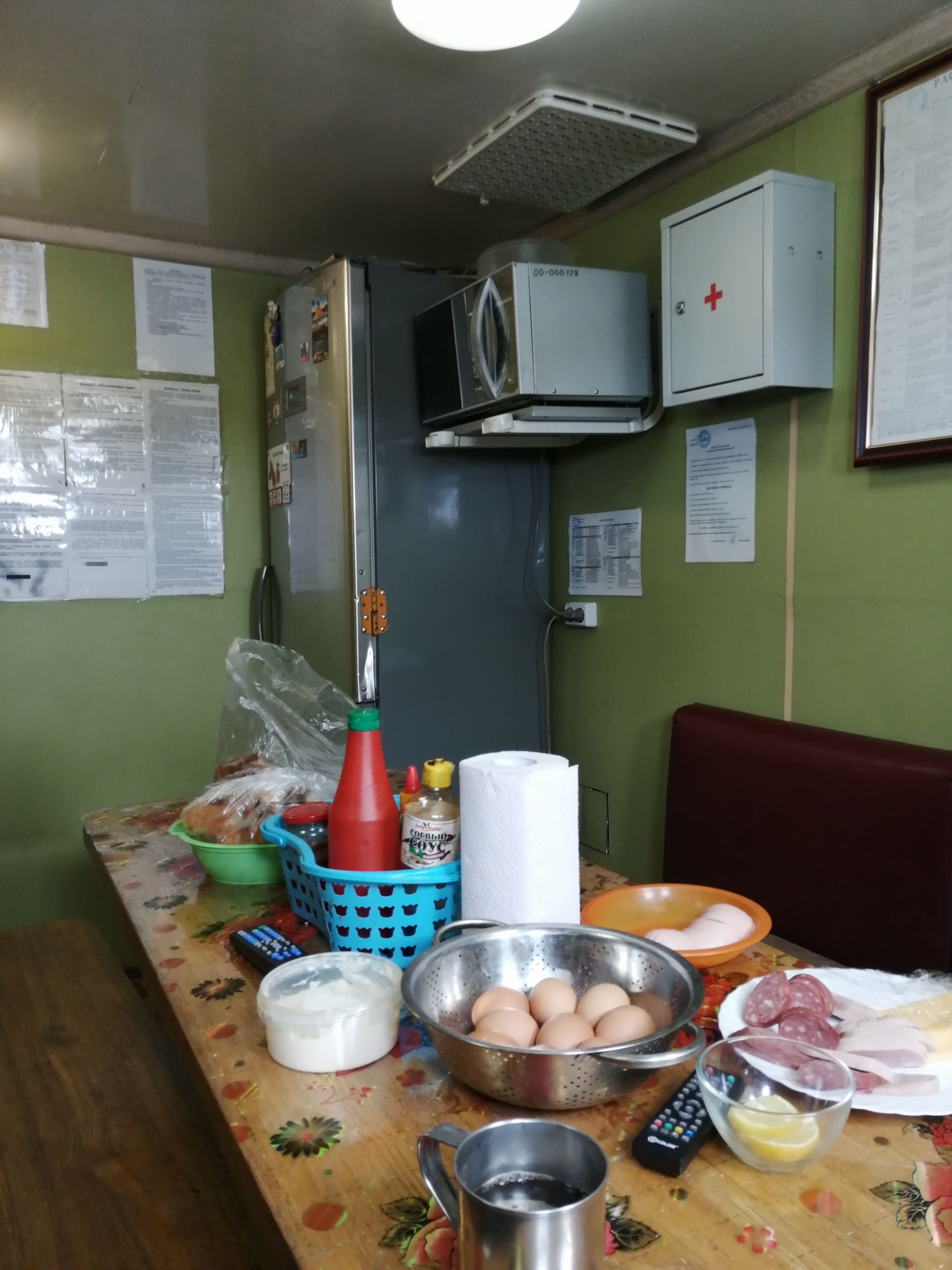 А ещё в день отправления мы успели позавтракать. Столовая на корабле совсем маленькая. Есть холодильник, микроволновка, стол с лавкой и диванчиком человек на 8 максимум (в тесноте, да не в обиде). Попали на какой-то крутецкий завтрак из яиц, сыра и колбасы. Даже обрадовались, но, как оказалось, это не типичный приём пищи (похоже, мы съели запасы команды).