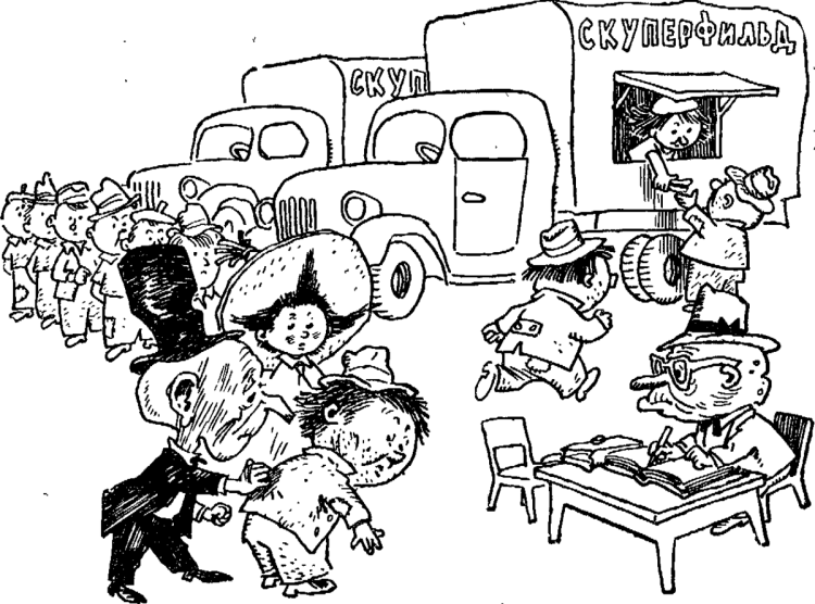 Продавщица из передвижного ларька тут же вручала коротышке бутерброд с сосиской, а управляющий заносил его имя в тетрадь и брал у него расписку в том, что он получил сосиску. Вся эта комедия с сосисками была придумана Скуперфильдом для того, чтобы новые рабочие увидели, какой он добрый, и получше работали на него. Нечего и говорить, что раздавал он сосиски не даром, а намеревался высчитать двойную их стоимость, когда будет расплачиваться с рабочими, и таким образом обтяпать попутно еще одно выгодное дельце.