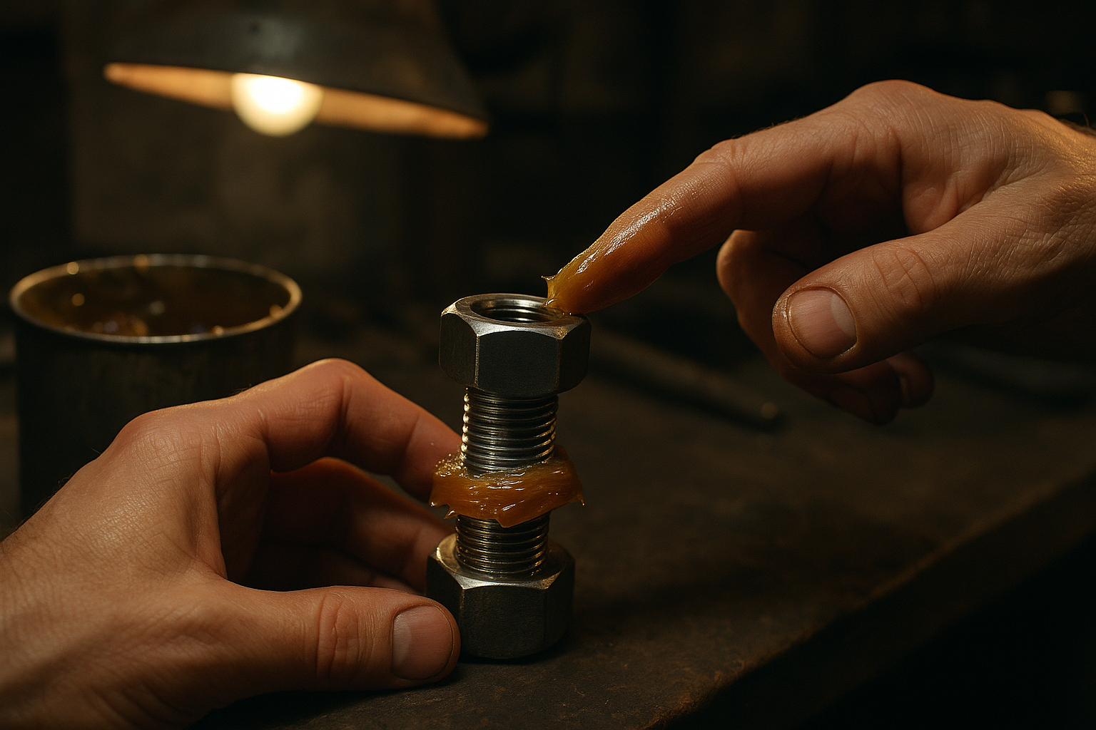 Я снова зачерпываю смазку, на этот раз чуть больше, потому что знаю, что грубая резьба может быть капризной. Пальцы скользят по металлу, оставляя за собой тонкий блестящий слой. Я беру гайку, проверяю ее на свет — резьба идеальна, ни одной заусеницы. Она чуть тяжелее предыдущей, и я представляю, как крепко она будет держать болт, как надежно они сцепятся. Начинаю завинчивать, и на этот раз процесс идет чуть медленнее — резьба сопротивляется, но смазка делает свое дело, смягчая трение. Я чувствую легкое тепло, которое исходит от металла, пока я продолжаю вращать гайку. Это тепло — результат трения, но оно такое приятное, такое живое.