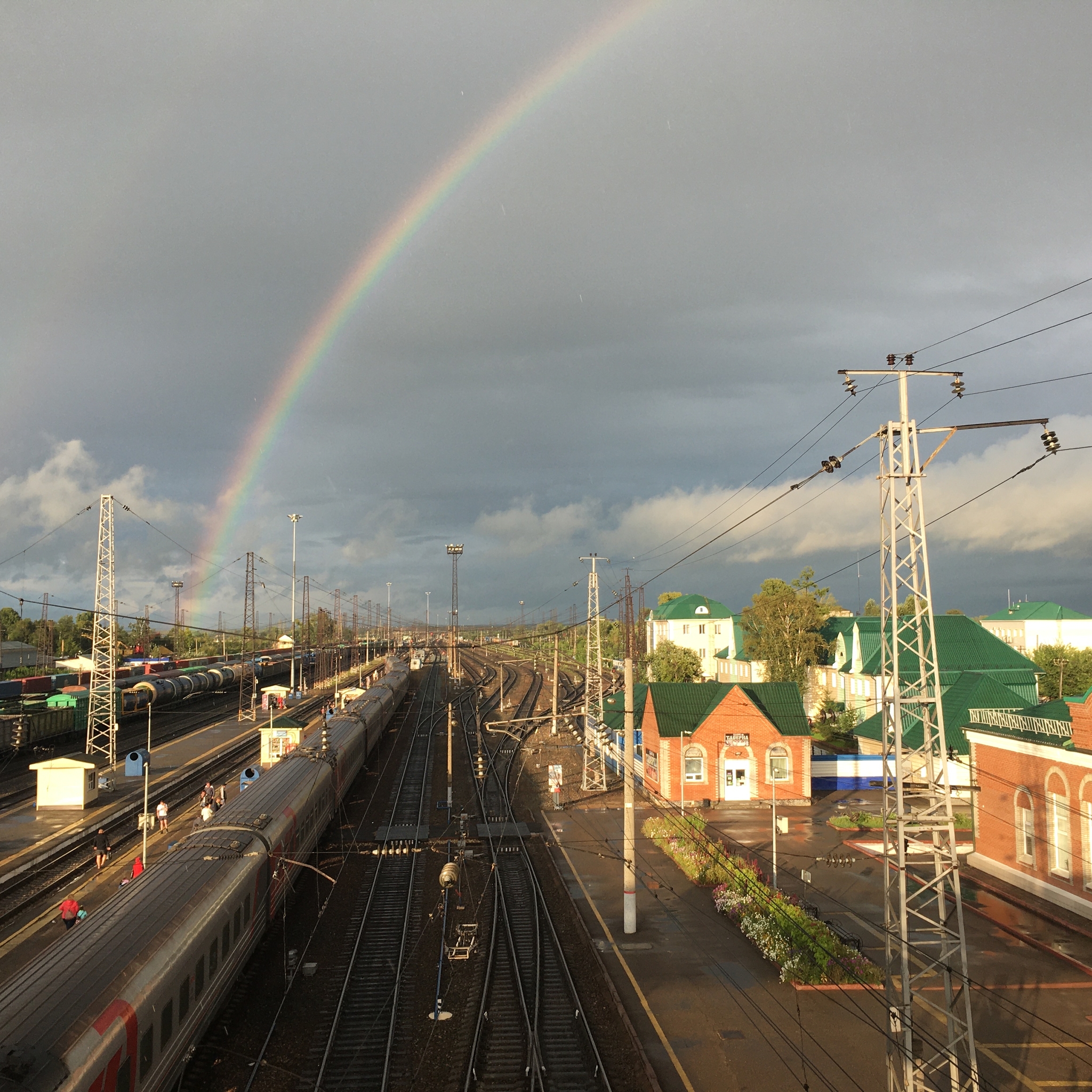 Тем временем дочалили до г. Мариинск. Унылейшее место, хотя рядом с вокзалом пятёрочка, аптеки и даже паровоз, который Транссиб и строил. И именно над этим унылейшим местом воссияла радуга. Какой декаданс!