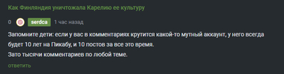 Прошлый пост о Калевале и карело-финских отношениях вышел в Горячее и вызвал действительно горячие споры, результатом которых стало удаление второго поста из серии из-за лишней политизированности. Хорошо. Пусть новый пост будет социально-культурным. Пусть это будет мое мнение по вопросу взаимосвязей между двумя народами. Мое мнение основано на книжных источниках, однако, они не считаются авторитетными здесь, в связи с чем я готов предоставить интернет-источники по каждому факту, какие удалось найти по теме. Основной тезис моего мнения заключается в том, что финны в течение XX века старались подавить самодостаточность карелов и их культуры. Мое мнение основано на фактах, которые изложены ниже. Еще раз повторю, что эти факты зафиксированы в изданиях, которые можно найти в КарНЦ РАН, но для Пикабу мне пришлось отыскать похожие статьи и материалы в интернете, поскольку тема отношений между финнами и карелами освещена достаточно широко. Итак, что именно в финском обществе было принято в XX веке для подавления самоидентичности карелов.