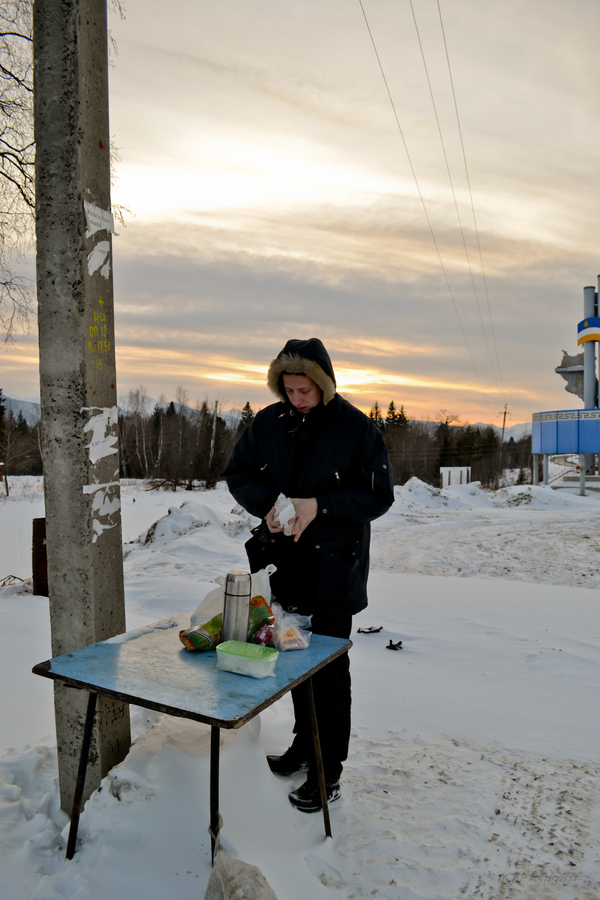 Спустя примерно час останавливаемся на привал в поселке Выдрино. Пикник на обочине, состоящий из сала, яиц и горячего чая, доставляет огромное удовольствие и насыщает нас.