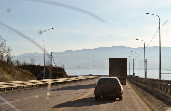 Впереди непростая дорога длиной около 1600 километров. На сложном участке пути от Иркутска до Байкальска постоянно приходится использовать стеклоомыватель. Ведь на дороге каша и вся она летит на лобовое стекло из-под колес большегрузов.