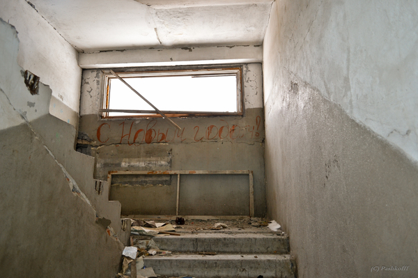 В квартирах разруха. Но нам удается несколько десятков удачных снимков. На них и сами квартиры, и вид с плит, которые раньше были балконами. На крышу лезть не решаемся - лестница в виде двери не кажется нам надежной.