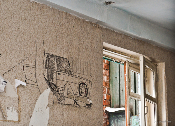 Еще видны рисунки на стенах и обоях, сделанные рукой бывших жильцов.