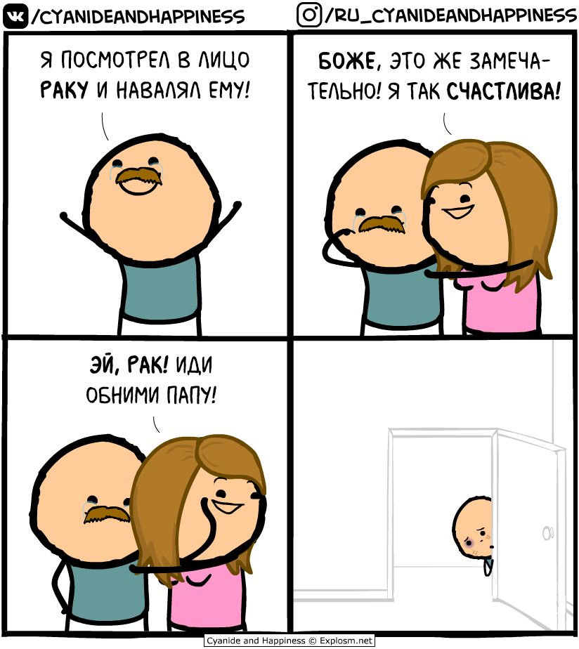50 Pcheloff 5 лет назад Победил рак (авторский перевод) Авторский перевод от Василия ТеловаСообщество с авторскими переводами: Cyanide and Happiness [моё] Комиксы Cyanide and Happiness Перевод Перевел сам Юмор Ещё 0