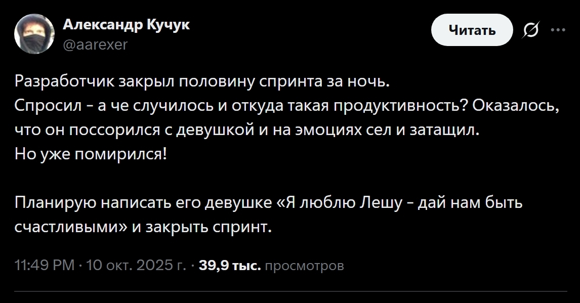 4500 Skyscrew IT-юмор Побудительная причина 1 месяц назад Скриншот X (Twitter) IT юмор Спринт Разработчики 533 31 5 2 2 2 1 1 Ещё 3