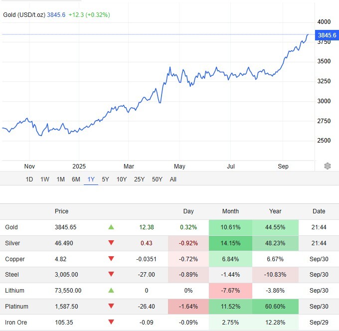 Во вторник цены на золото сползли с пика рекордного максимума выше $3860 до $3845 за унцию. Но с начала года золото выросло примерно на 47% и находится на пути к самому большому годовому приросту с 1979 года. Короче, мало кто сомневается, что золото не пойдет дальше вверх.