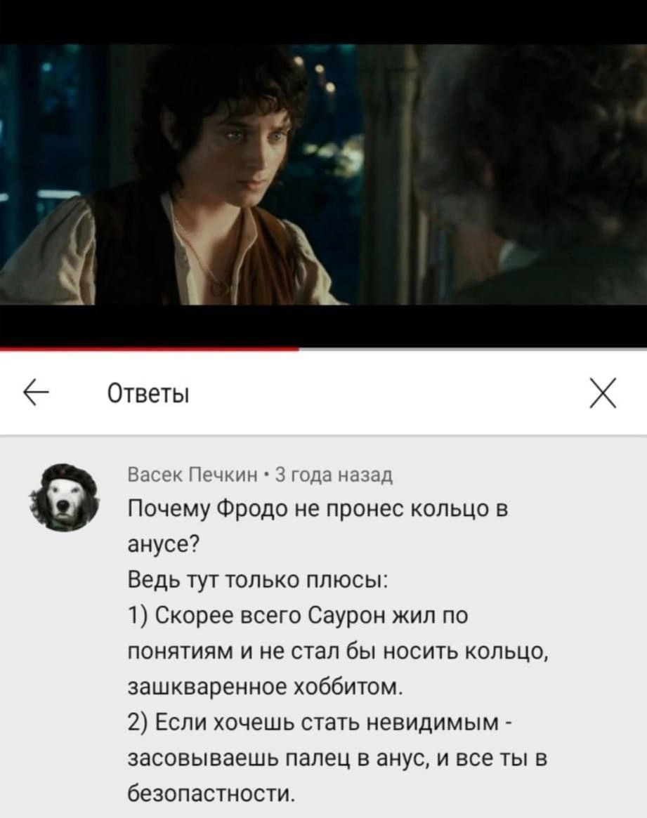 13 FedorenKo Специфический юмор Почему?… 4 месяца назад Юмор Повтор Картинка с текстом Властелин колец Фродо Бэггинс Кольцо всевластия Хоббит 3 Ещё 0