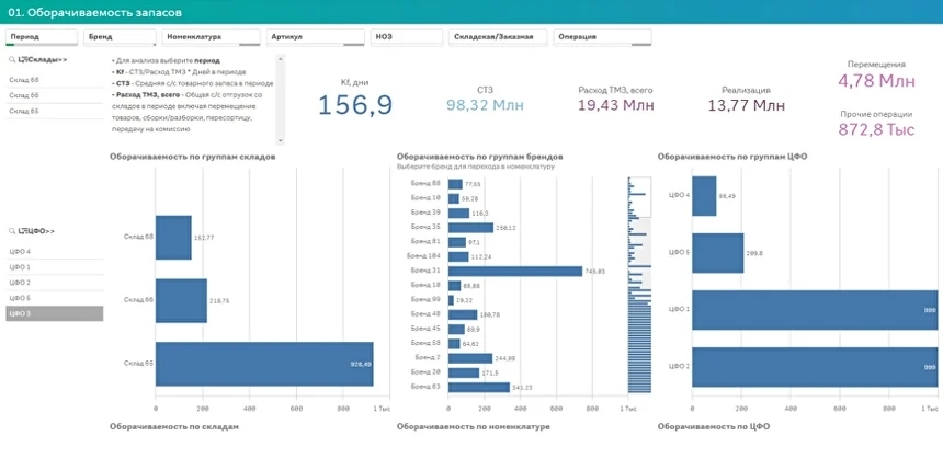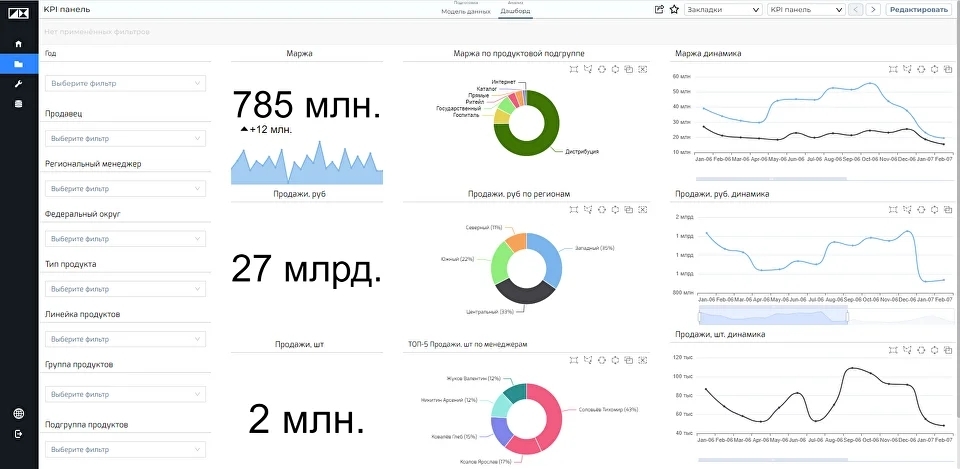 Для создания такой отчетности требуется объединить данные из 1С и других систем и визуализировать их в едином пространстве – BI-дашбордах.