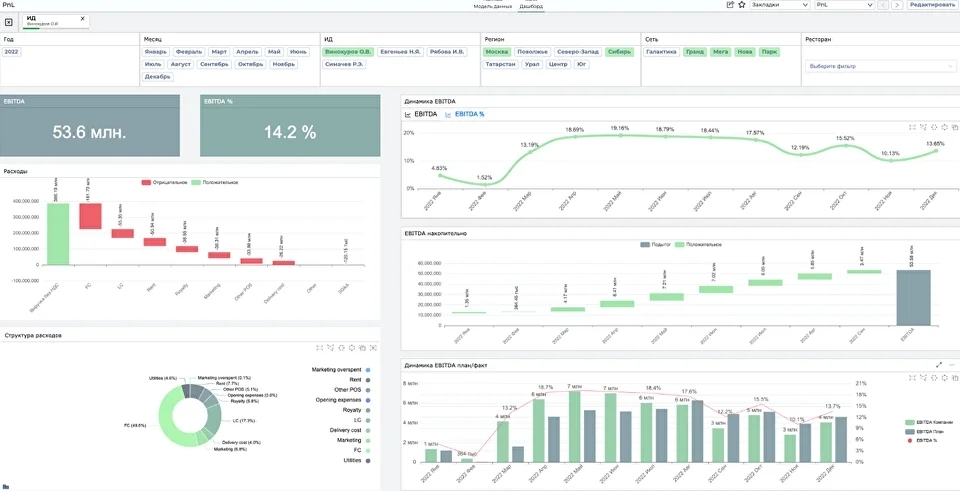 Включает в себя отчеты P&L, баланс, структуру затрат, план-фактный анализ