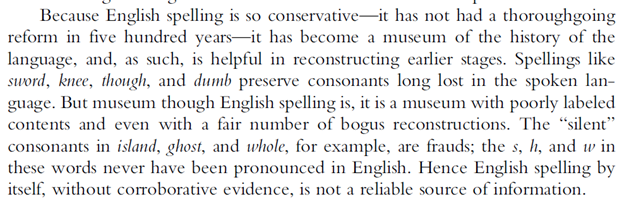 Иногда этимологизирующие написания опирались на ошибочные представления. Так, rime «рифма» стали писать как rhyme /райм/, поскольку посчитали, что оно происходит от греческого ῥυθμός «ритм». На самом же деле в английский оно пришло из старофранцузского rime, а туда – из франкского (франки, напомню, говорили на германском языке).